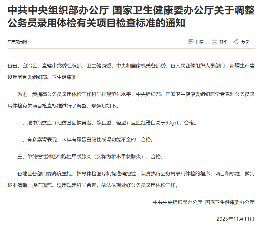 据共产党员网11月14日消息,中共中央组织部办公厅、国家卫生健康委办公厅近日发出通知称,为进一步提高公务员录用体检科学化、规范化水平,中共中央组织部、国家卫生健康委组织医学专家对公务员录用体检相关项目检查标准进行调整。调整内容如下: · 地中海贫血(地中海贫血基因携带者、静息型、轻度型)、血红蛋白高于90g/L为合格。 · 尿蛋白不阳性或肾功能不全的多囊肾患者符合资格。 · 单纯性慢性淋巴细胞性甲状腺炎(又称桥本甲状腺炎)一致。通知要求,各地区、各部门要高度重视信息化,指导体检和医疗机构准确理解并认真落实文职人员体检方法、项目和标准,落实明确的标准、操作规范和科学合理的适用规定,依法依规对公务员进行体检。南方网广东考察记者 卢少聪 Copyright © 2024-2026 58爆料网每日精选最新消息-每日大赛黑料爆料-166fun热点黑料传送门 版权所有