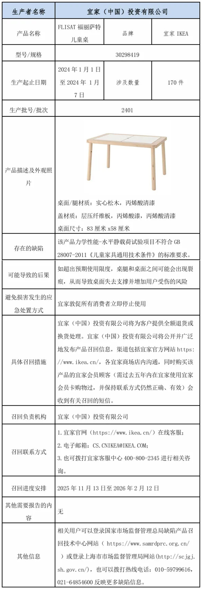11月14日,根据上海市市场监管局通报,宜家(中国)投资有限公司召回2024年1月1日至2024年1月7日、2025年11月13日至2026年2月12日生产的宜家宜家品牌Flisat儿童桌,共计170件。通知称,召回原因为产品力学性能——水平静载测试项目不符合GB 28007-2011《儿童家具通用技术条件》要求的标准。桌腿和桌面之间可能会出现裂缝,导致桌面失去支撑并增加用户受伤的风险。该通知建议消费者立即停止使用该产品。宜家将为顾客提供全额退款或换货。南方网广东考察记者 陈玉云 Copyright © 2024-2026 58爆料网每日精选最新消息-每日大赛黑料爆料-166fun热点黑料传送门 版权所有
