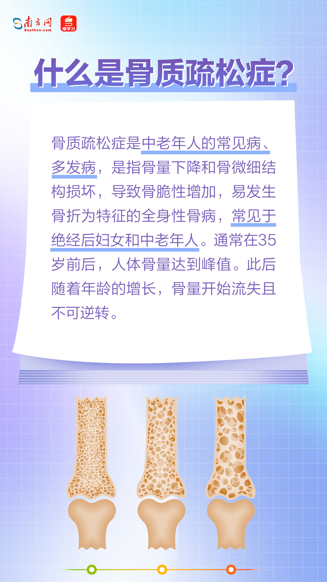 每年的10月20日是世界骨质疏松日。骨质疏松症是一种“无声的流行病”,其特征是骨质流失和骨微结构破坏,导致骨强度下降,骨折风险显着增加。目前,我国约有9000万骨质疏松症患者,其中女性近7000万。哪些人容易患骨质疏松症?我们该如何预防和应对?我们一起来看看吧。策划:卢少聪 设计:曹亚勤 校对:陈学德